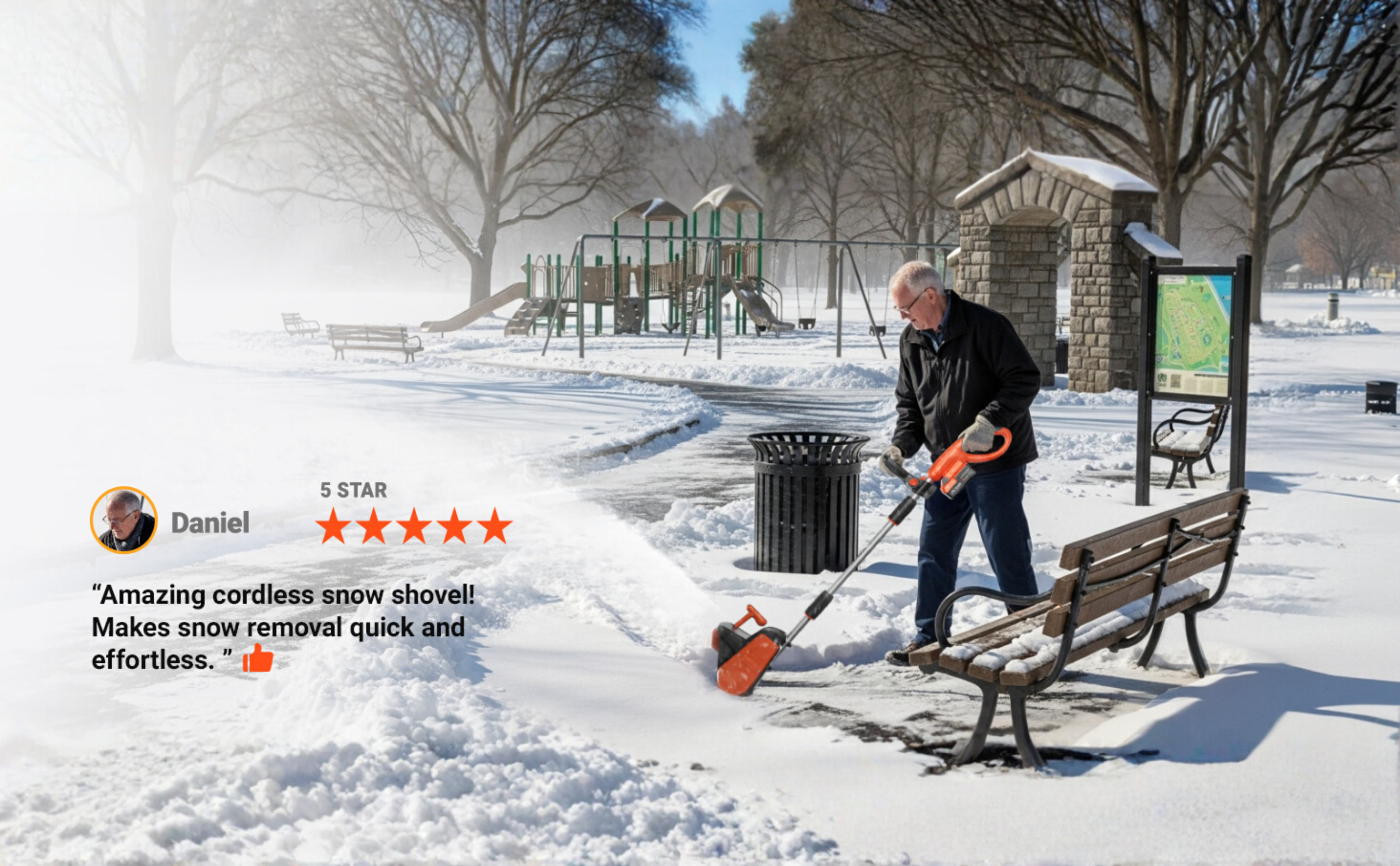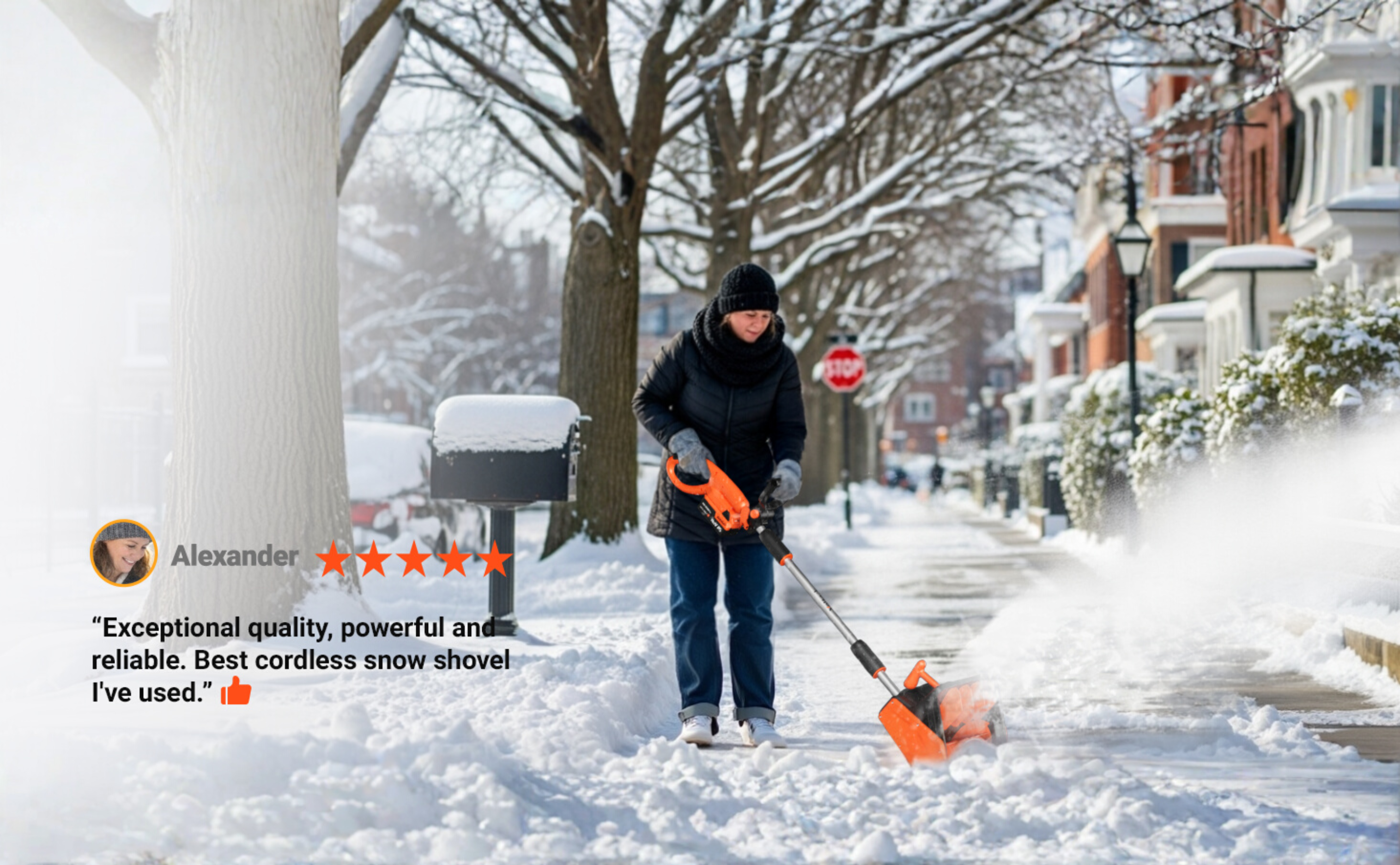 ❄️【Lightweight & Powerful Performance】Take on winter with ease. This compact cordless snow shovel weighs only 9.3 lbs, making it incredibly easy to maneuver. Powered by a 24V high-performance motor and a 4.0Ah rechargeable lithium-ion battery, it throws snow up to 20 ft and offers up to 25 minutes of reliable runtime—perfect for quick, efficient clearing.