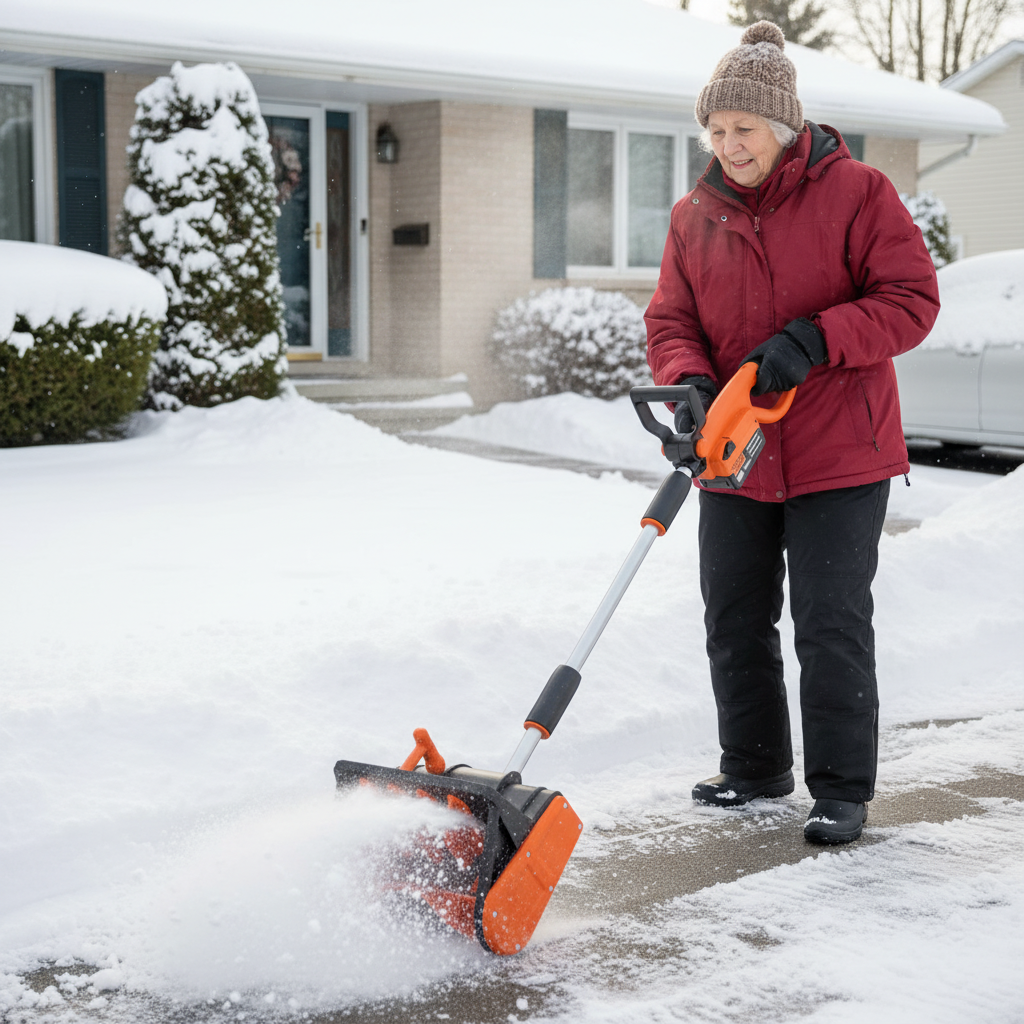 ❄️【Quiet, Versatile, And Effective】Clear pathways with confidence. This electric snow shovel removes snow up to 13 inches wide and 6.5 inches deep, making it perfect for driveways, patios, sidewalks, steps, and decks. It also operates quietly—ideal for early-morning snow removal without disturbing neighbors.